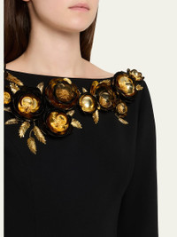 Carolina Herrera dress adorned with 3D metallic floral embellishments along the neckline Boat neckline Long sleeves Hem falls below the knee A-line silhouette Invisible back zipper Silk Dry clean Made in USA Online Inquiries: BGS21_BA9JP| Store Inquiries: #5021094