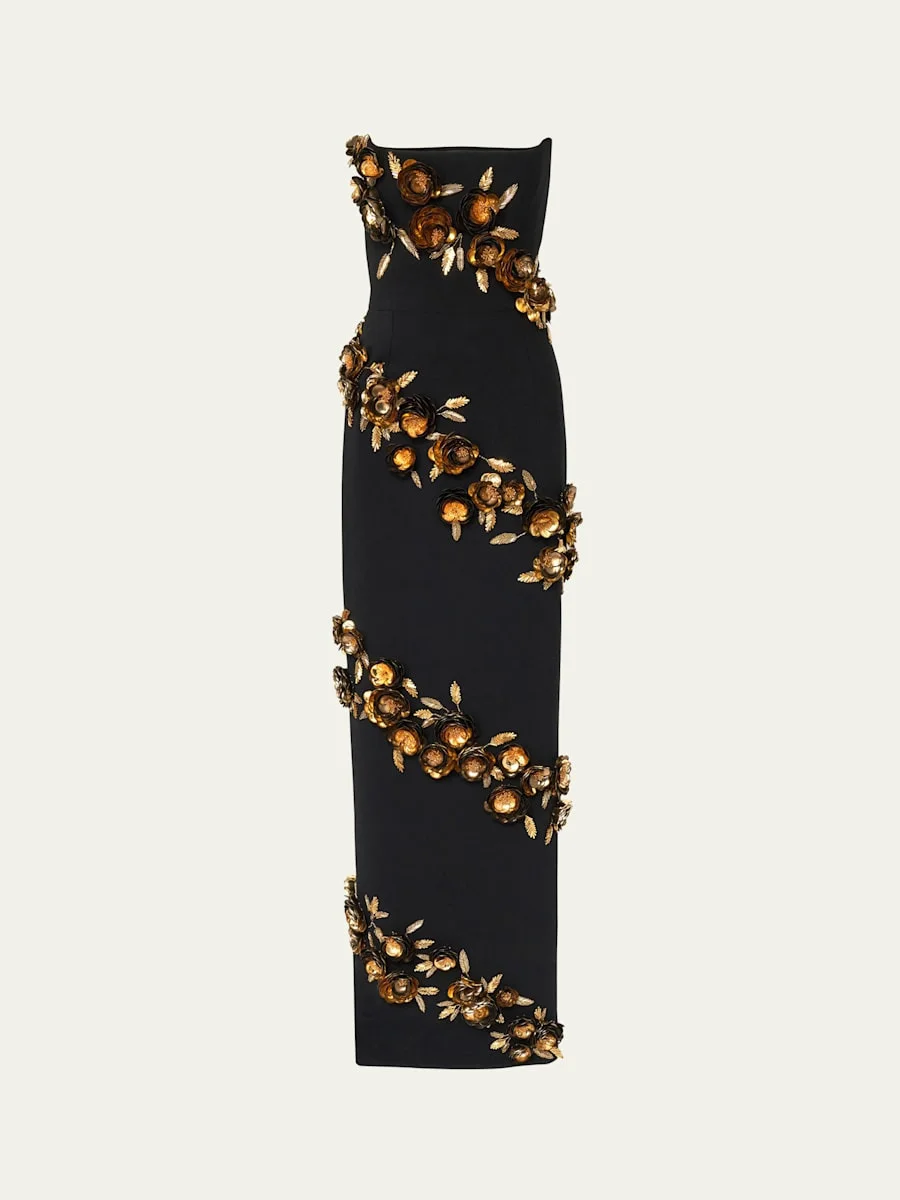 Carolina Herrera gown embellished with 3D metallic florals in a wraparound placement Strapless neckline Sleeveless Back vent Full length Column silhouette Invisible back zipper Polyester Dry clean Made in USA Online Inquiries: BGS21_BA9JQ| Store Inquiries: #5021095