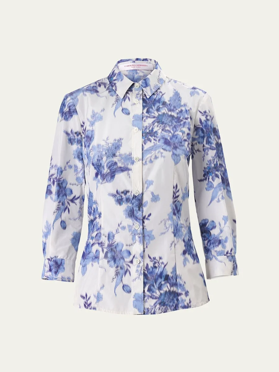 Carolina Herrera "Icon" blouse featuring a blur floral print and slimming waist darts Point collar; button front Bracelet sleeves; button cuffs Back yoke Slim fit Polyester Dry clean Made in Italy Online Inquiries: BGS21_B9YP6| Store Inquiries: #5003848