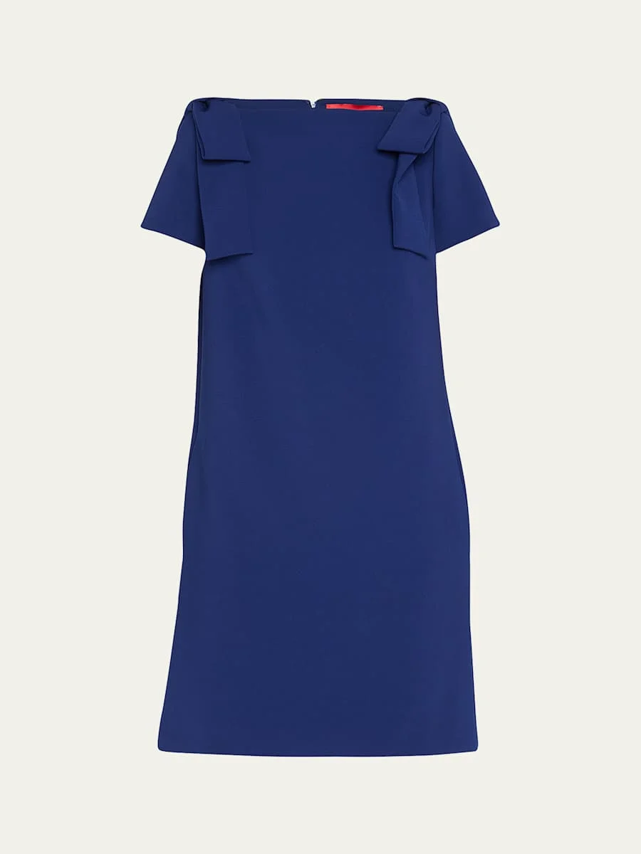Carolina Herrera shift dress with bow details at the shoulders Crew neckline Short sleeves Slit pockets at sides Zipper closure at back Relaxed fit Hem falls above the knee; 37.5" from the shoulder Polyester/polyurethane Dry clean Made in Italy