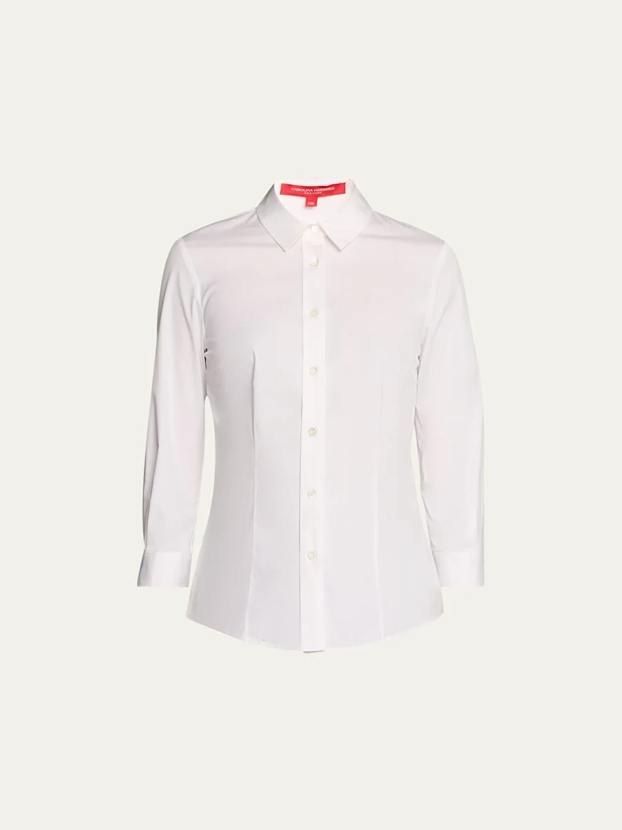 Carolina Herrera shirt in cotton poplin. Approx. length; 25" from shoulder to hem. Spread collar; button front. Three-quarter sleeves. Fitted. Shirttail hem. 97% cotton, 3% polyurethane. Dry clean. Made in USA of Italian materials. Model is 5'10"/177cm. Online Inquiries: BGS21_B4N40| Store Inquiries: #2768932