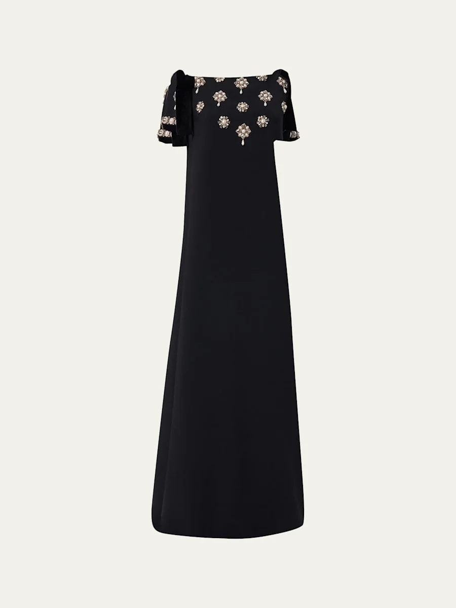 Homage to timeless romance and grand soiree glamour, this Carolina Herrera gown is richly embroidered with medallion motifs that cascade down its flowing silhouette, accentuated by elegant velvet bow detailing at the shoulders High neckline Short sleeves Column silhouette Floor sweeping hem Walking vent back Back zip Polyester/polyurethane Dry clean Imported Online Inquiries: BGS21_BB210| Store Inquiries: #5444802