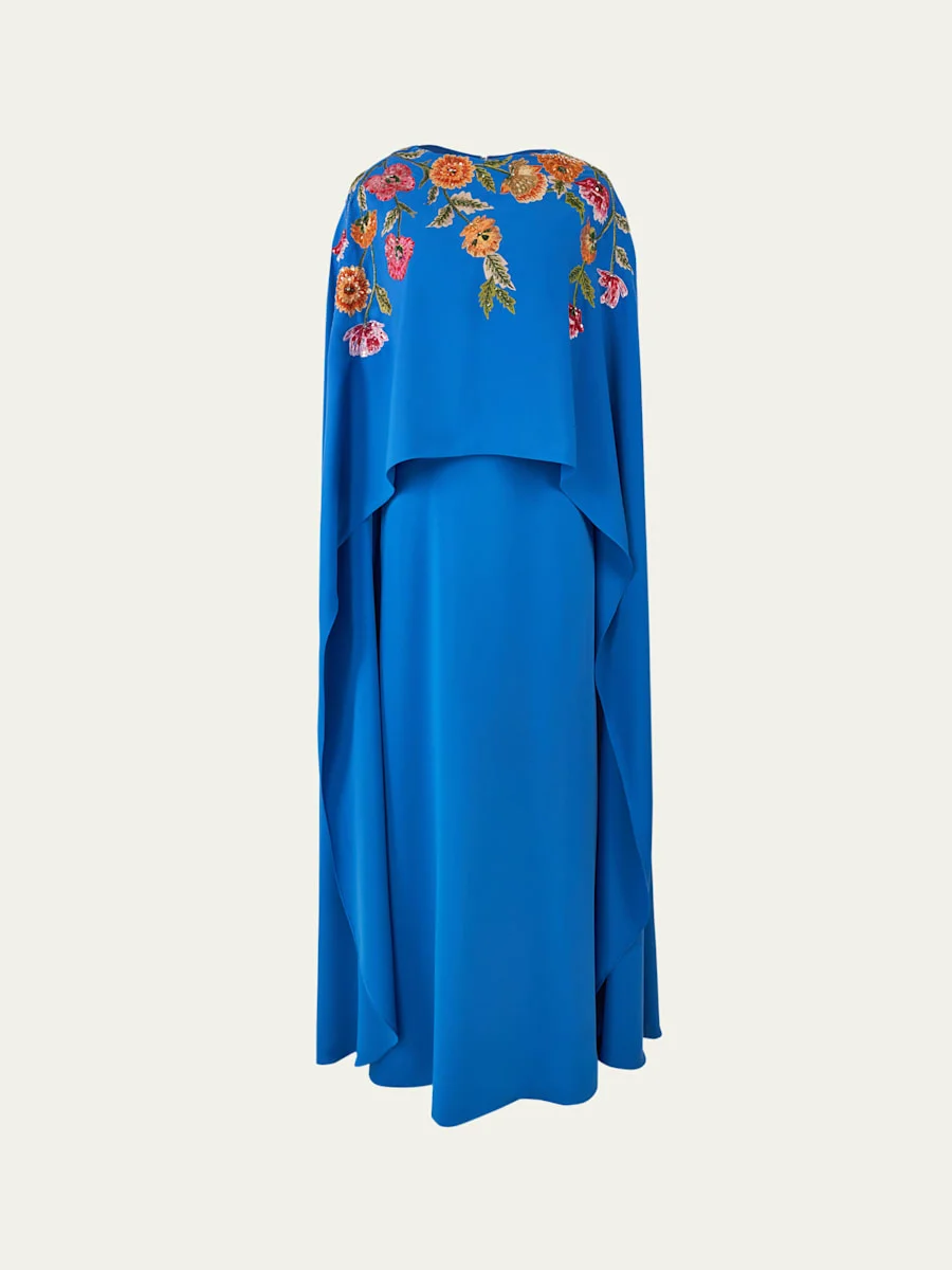 Carolina Herrera caftan gown flows with a highlow cape embellished with floral sequin embroidery along the front High neckline Long sleeves Aline silhouette Floor sweeping hem Invisible back zip Polyester Dry clean Imported