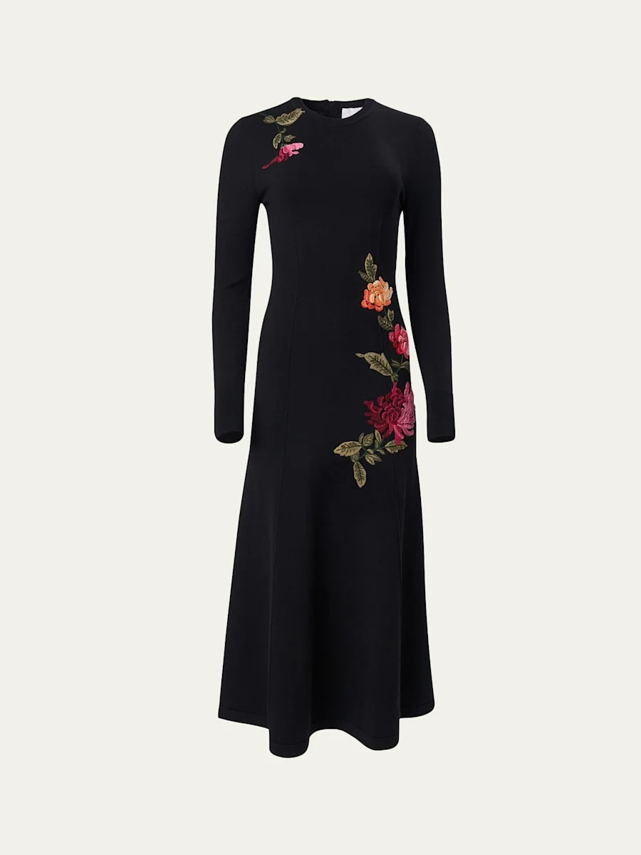 Chrysanthemum-Embroidered Midi Knit Dress