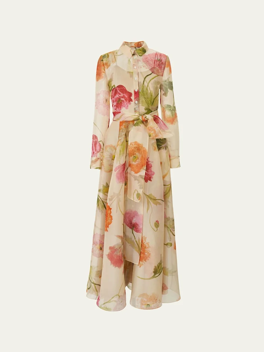 Floral Silk Organza Belted Long-Sleeve Maxi Trench Dress
