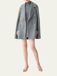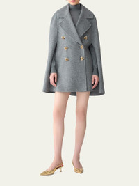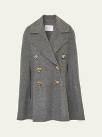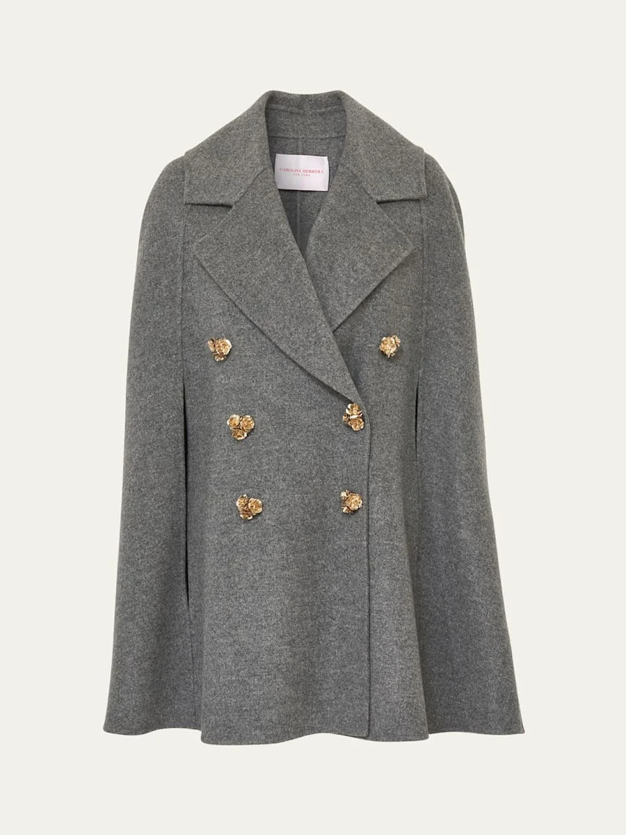 Carolina Herrera brushed wool cape featuring goldtone flower buttons Notch lapels; double-breasted front 3/4 slit sleeves A-line silhouette Hem falls below the hip Snap closure Virgin wool Dry clean Made in Italy Online Inquiries: BGS21_D5C79| Store Inquiries: #5068274