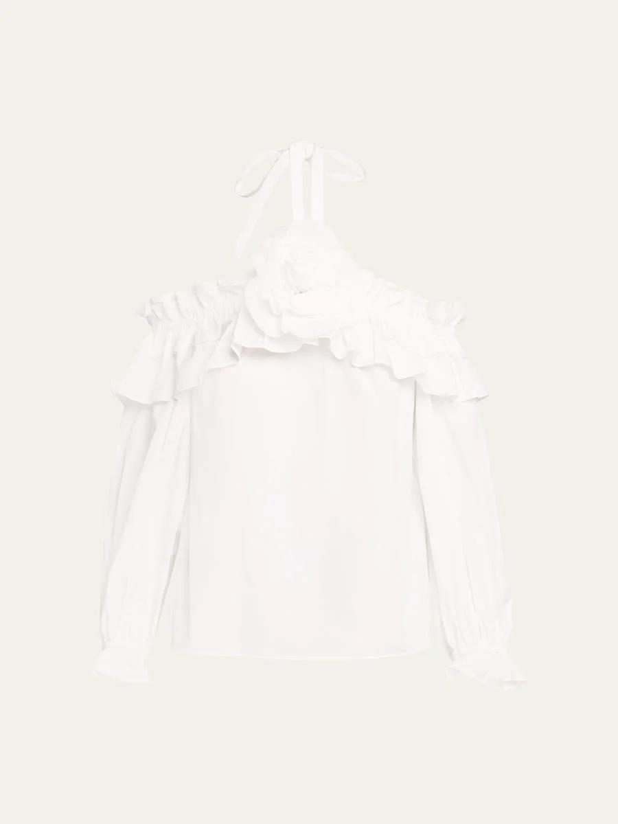 Carolina Herrera ruffle top with a flower embellishment at the neck Halter neckline; cold-shoulder Long sleeves; elastic cuffs Relaxed fit Self-tie closure Cotton/polyurethane Dry clean Made in USA Online Inquiries: BGS21_B9L47| Store Inquiries: #4894710