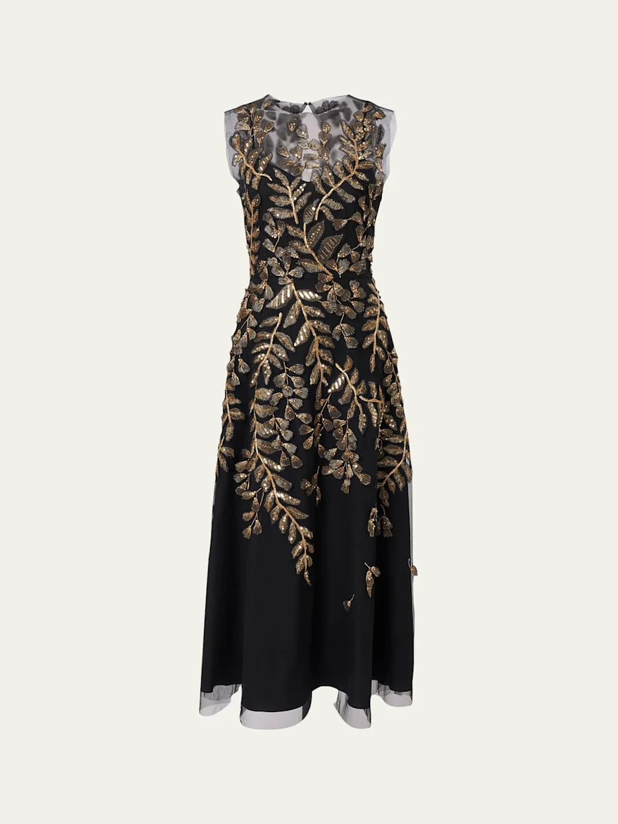 Gold Leaf-Embroidered Tulle Sleeveless Midi Dress