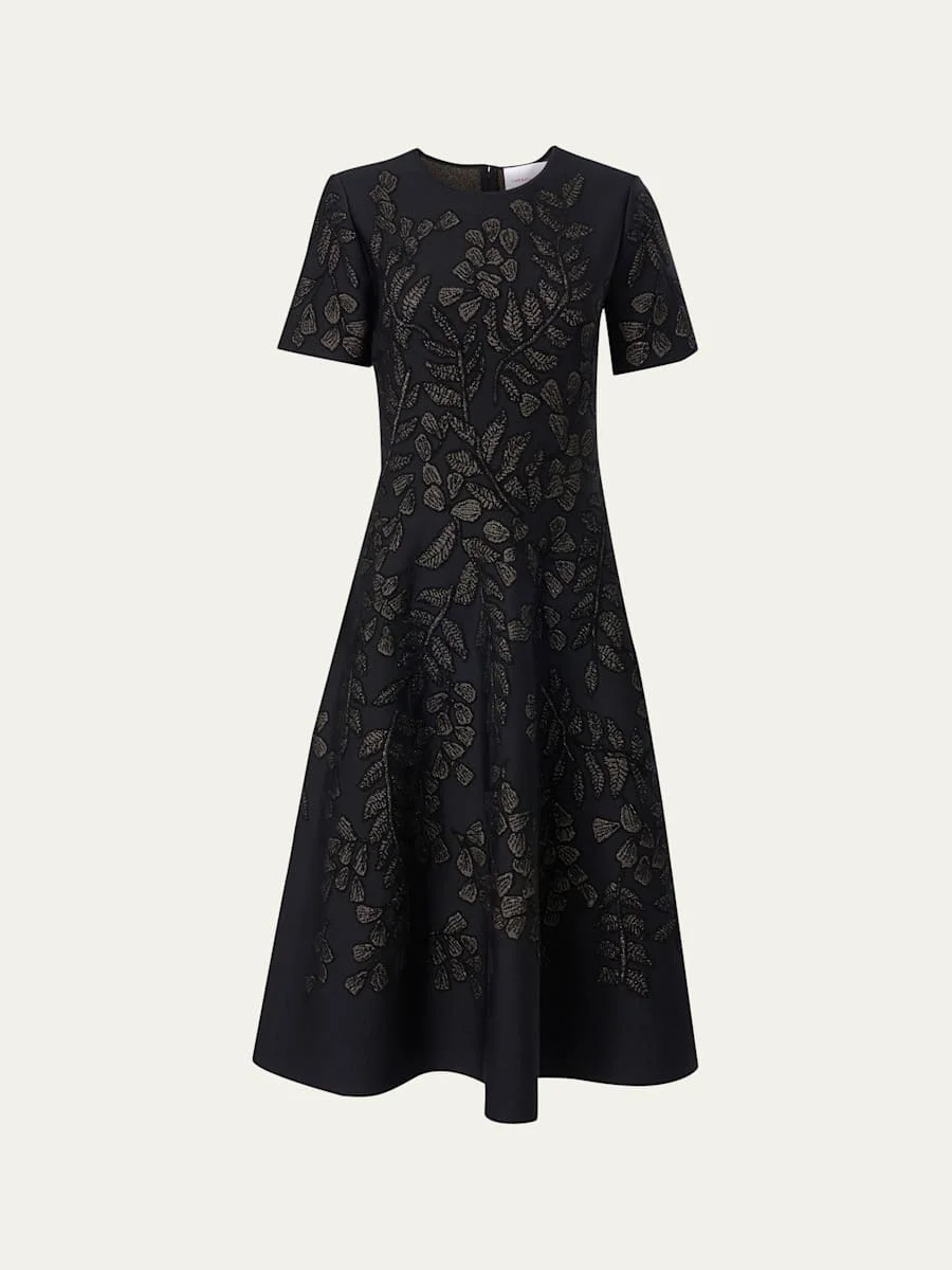 Carolina Herrera cocktail dress woven with gold Lurex® branch motifs for understated elegance Round neckline Short sleeves Hem falls below the knee Fit & flare silhouette Concealed back zip closure Viscose/elastane Dry clean Made in Italy Online Inquiries: BGS21_BB22N| Store Inquiries: #5445092