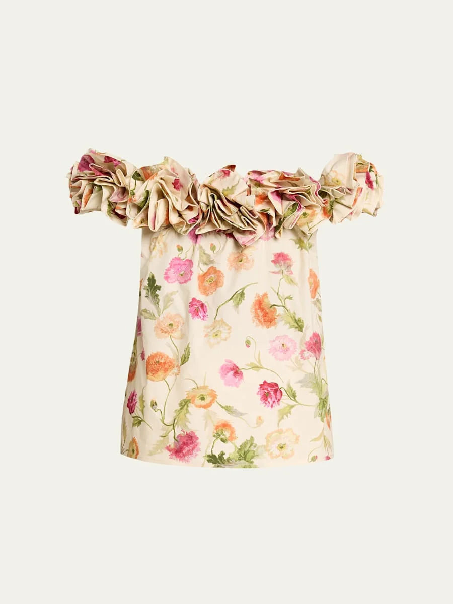 Carolina Herrera top is crafted of a rose printed cotton stretch with sculptural rose applique along the neckline Off-the-shoulder neckline Short sleeves Relaxed fit Pullover style Cotton/elastane Dry clean Made in USA Online Inquiries: BGS21_BB33Z| Store Inquiries: #5473529