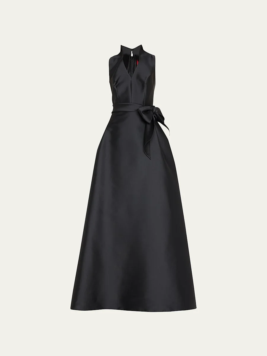 Carolina Herrera Icon gown in satin. V neckline with stand collar. Sleeveless. Self bow at waist. A-line silhouette. Floor length. Back zip. Polyester/silk. Silk lining. Made in USA. Online Inquiries: BGS21_B55ET| Store Inquiries: #3197090