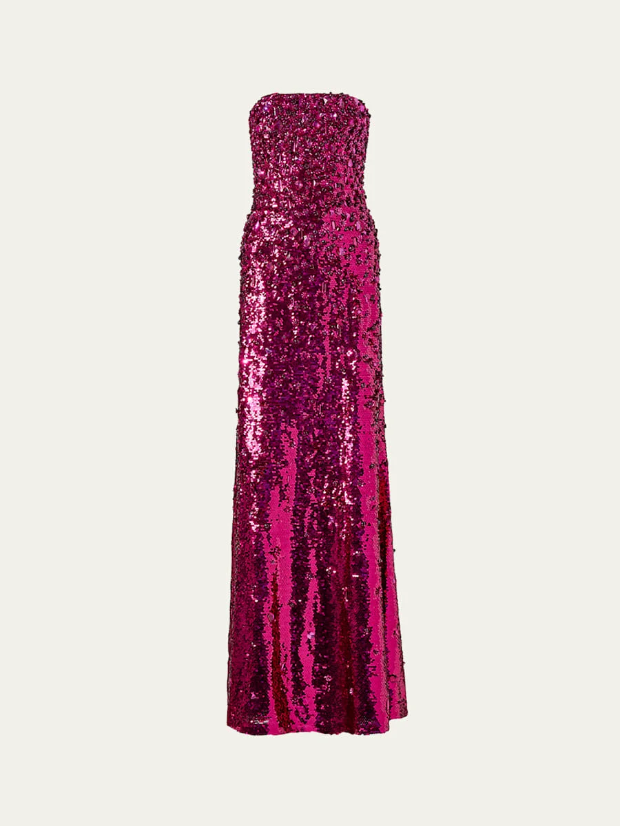 Carolina Herrera sequin-embellished gown Strapless neckline Sleeveless Hem pools floor Sheath silhouette Zip closure Virgin wool/elastane Dry clean Made in Italy Model is 5'10"/177cm. Online Inquiries: BGS21_B9LBU| Store Inquiries: #4901400