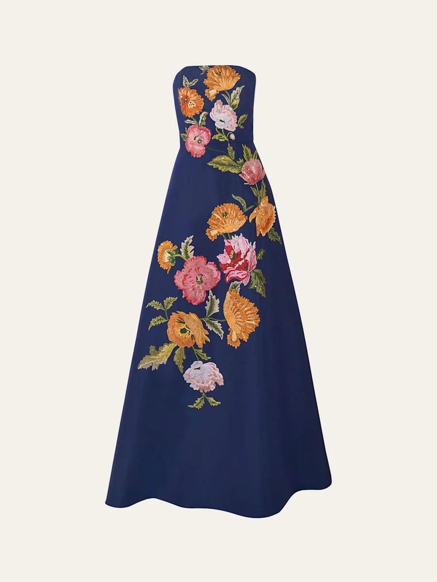 Floral-Embroidered Strapless Gown