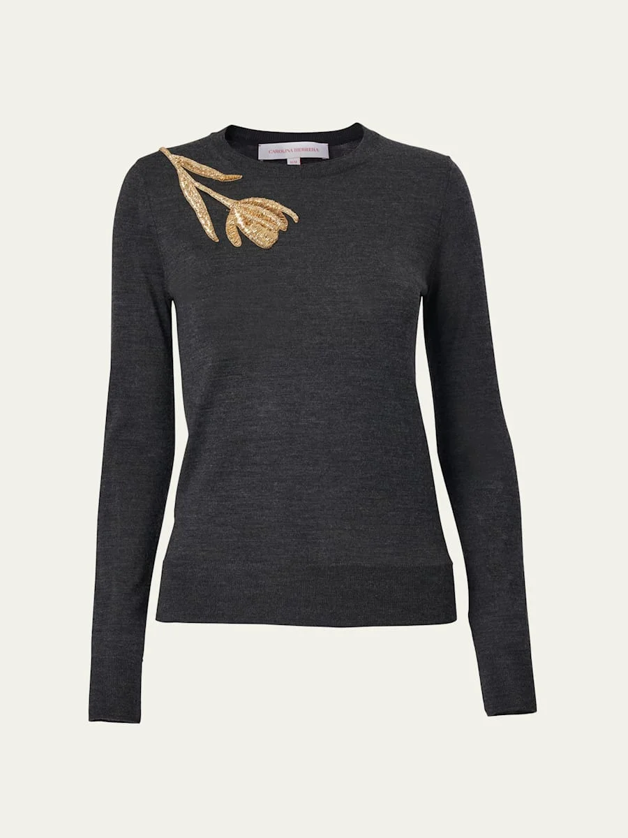 Carolina Herrera lightweight sweater embellished with a metallic 3D tulip across the right shoulder Crew neckline Long sleeves Slim fit Hip length Pullover style Virgin wool/silk Dry clean Imported Online Inquiries: BGS21_BA9JF| Store Inquiries: #5021083
