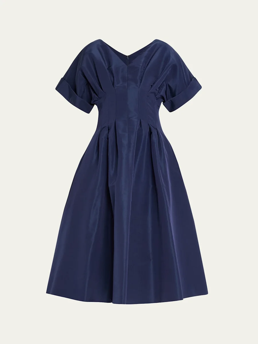 Carolina Herrera dress is a refined staple in silk with a figure-flattering pleated waist that subtly flares at the skirt V neckline Short sleeves Rolled cuffs Fit-and-flare silhouette Hem falls below the knee Back zip Silk Dry clean Made in USA Online Inquiries: BGS21_BB348| Store Inquiries: #5473541