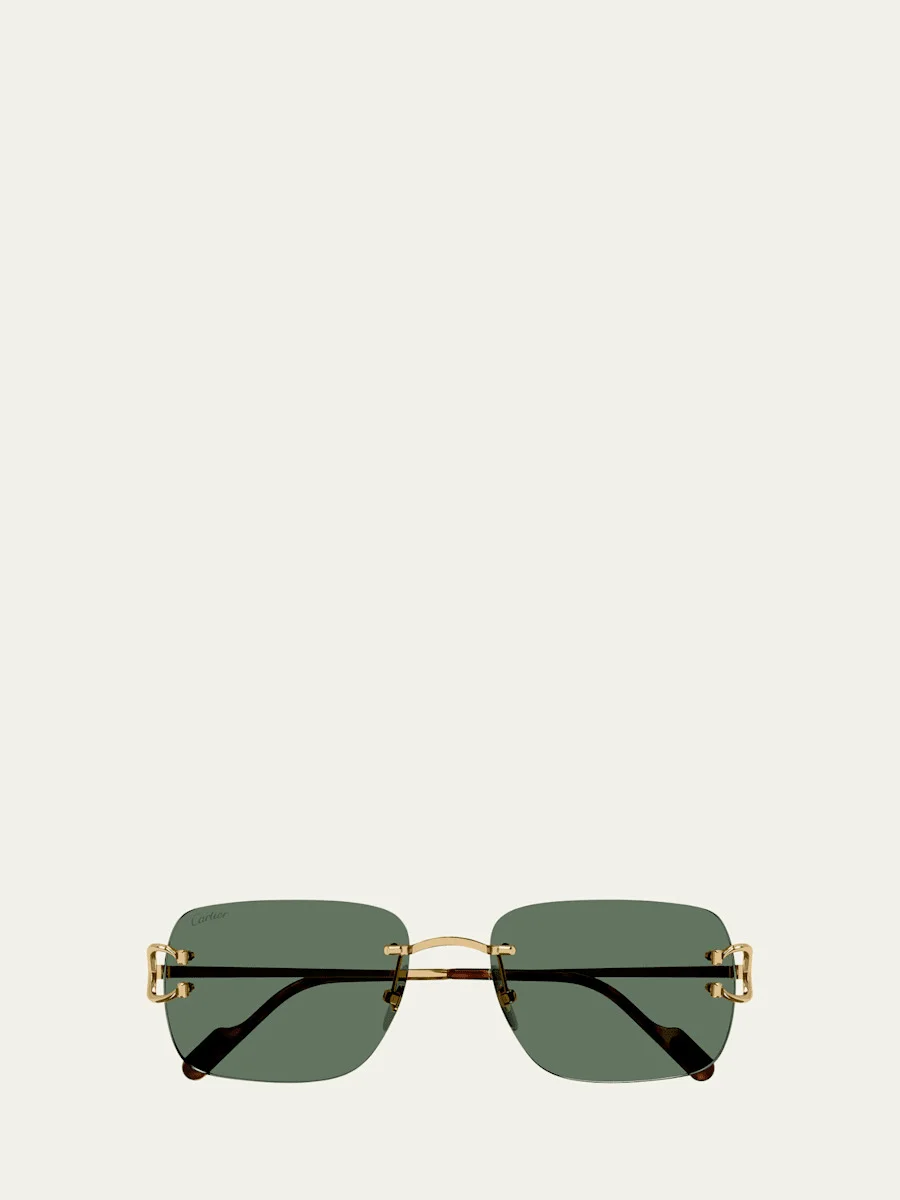 Cartier rectangle sunglasses in luxurious smooth metal Eye/bridge/temple (in mm): 57-18-140 Rimless Adjustable nose pads Solid-color lenses Etched logo on lens Signature c-logo at temples Thin arms; curved, capped temple tips Gold-tone/silvertone hardware 100% UVA/UVB protection Made in France Proposition 65 warning for California residents Online Inquiries: BGS21_N8WJZ| Store Inquiries: #4235393