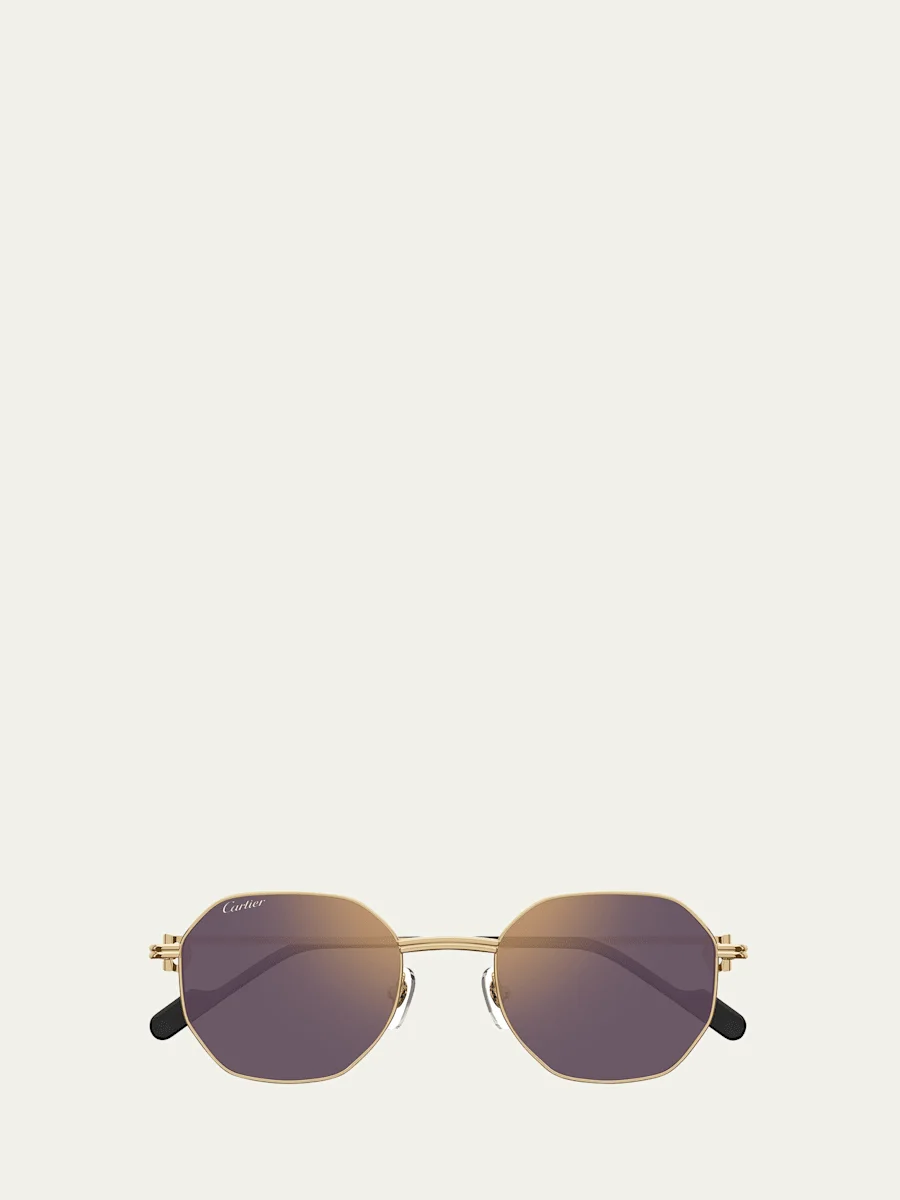 Cartier round sunglasses in metal Lens/bridge/temple (in mm): 5021145 Mirrored lenses Adjustable nose pads Logo on hinges Thin, tapered arms Capped earpieces 100% UVA/UVB protection Made in France