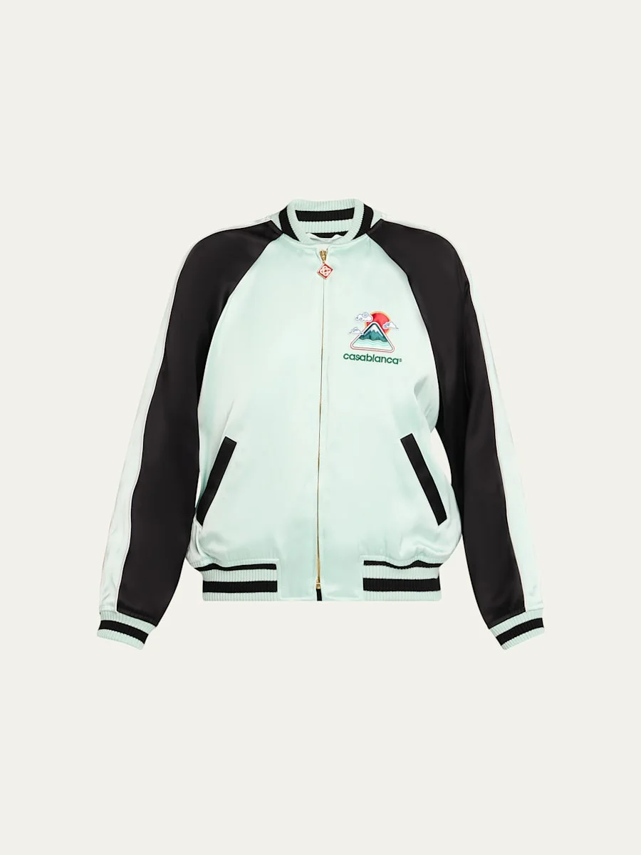 CASABLANCA satin bomber jacket featuring logo mountain embroidery on the chest and back Baseball collar; zip front Long raglan sleeves Hip welt pockets Relaxed fit Ribbed cuffs and hem Viscose Made in Portugal Online Inquiries: BGS21_BA58Z| Store Inquiries: #5039305