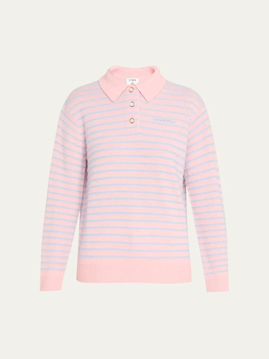 Crafted from fuzzy woolblen knit, this polo sweater from CASABLANCA features a striped interior, logo embroidered chest, and pearlescent buttons Point collar; threebutton front Long sleeves Drop shoulders Relaxed fit Hip length Rbbed cuffs and hem Pullover style Wool/polyester Imported