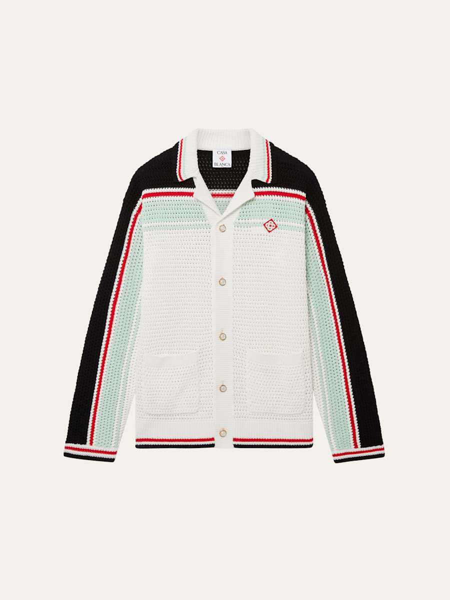 CASABLANCA crochet knit casual button-down shirt detailed with contrast stripes and ribbed trim Notch collar Button placket Pearly buttons Long sleeves Ribbed cuffs and hem Hip patch pockets Cotton Hand wash Imported Online Inquiries: BGS21_NDPCJ| Store Inquiries: #5059206