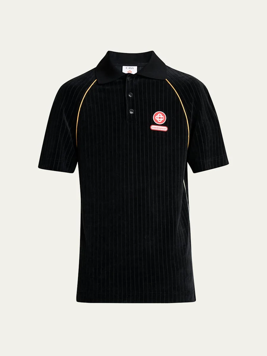 CASABLANCA polo shirt in ribbed velvet, accented with sporty lines and monogram appliques Spread collar Three-button placket Short raglan sleeves Vented sides Pullover style Lyocell/cotton/polyester Machine wash cold Made in Portugal Online Inquiries: BGS21_NDTCC| Store Inquiries: #5081257