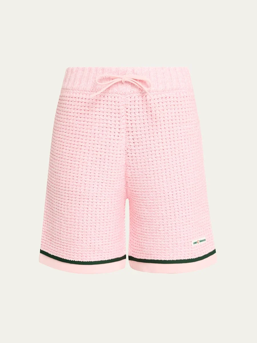 CASABLANCA mouline knit shorts with a drawstring waistband, logo patch, and contrast stripe hem Mid rise sits high on hip Straight legs Bermuda length Pull-on style Cotton/nylon/polyamide/elastane Imported Online Inquiries: BGS21_BA58W| Store Inquiries: #5039302