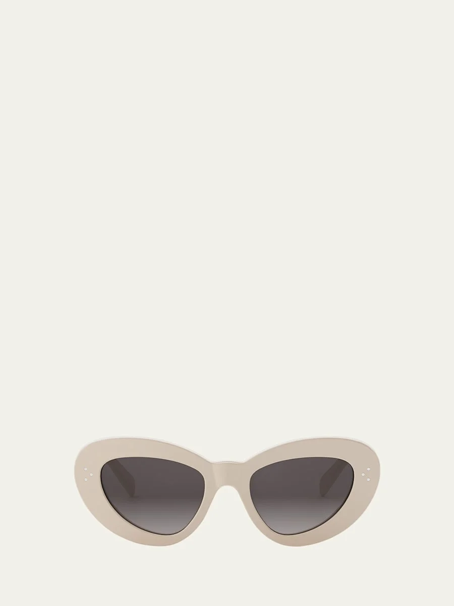 Celine cateye sunglasses featuring the brand's classic 3 dots Eye/bridge/temple (in mm): 5220140 Solid lenses Saddle nose bridge Wide, tapered arms Iconic ogo at the temples Acetate 100% UVA/UVB protection Made in Italy