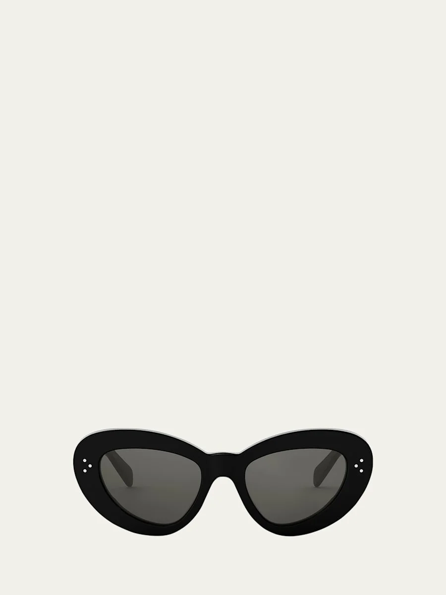 Celine cat-eye sunglasses featuring the brand's classic 3 dots Eye/bridge/temple (in mm): 52-20-140 Solid lenses Saddle nose bridge Wide, tapered arms Iconic ogo at the temples Acetate 100% UVA/UVB protection Made in Italy Proposition 65 warning for California residents Online Inquiries: BGS21_D5E2H| Store Inquiries: #5023861