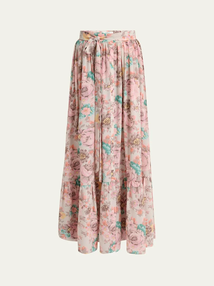 Chloe maxi skirt crafted in floral-print silk Sits high on the hips Attached waist self-tie On-seam pockets A-line silhouette Flounce ruffle hem Full length Silk Dry clean Imported Online Inquiries: BGS21_BA3CM| Store Inquiries: #5024478