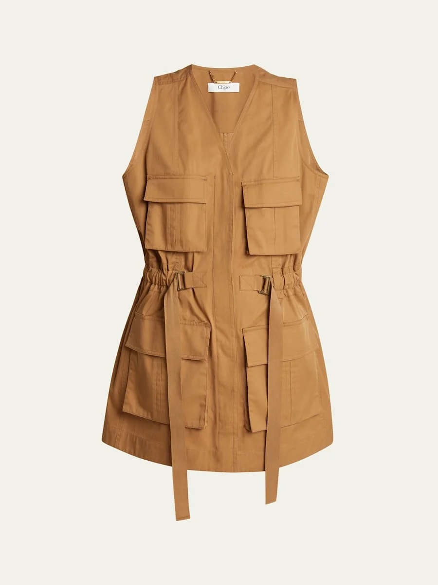 Chloe utilitarian vest in cotton canvas with an integrated belt V neckline; hidden button placket Sleeveless Oversized flap pockets Straight fit Cotton self/lining Made in Italy Online Inquiries: BGS21_B9XUU| Store Inquiries: #4997201