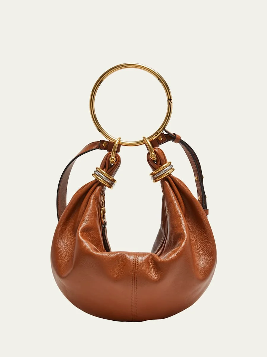 Chloe bracelet top handle bag in shiny-grained calfskin leather Removable bracelet metal ring top handle Detachable, adjustable shoulder strap Can be worn as a top handle or shoulder bag Zip top closure Interior, one card slot Lining: Leather Approx. 5.5"H x 12.5"W x 3.9"D Made in Italy Online Inquiries: BGS21_V6N5X| Store Inquiries: #4839456