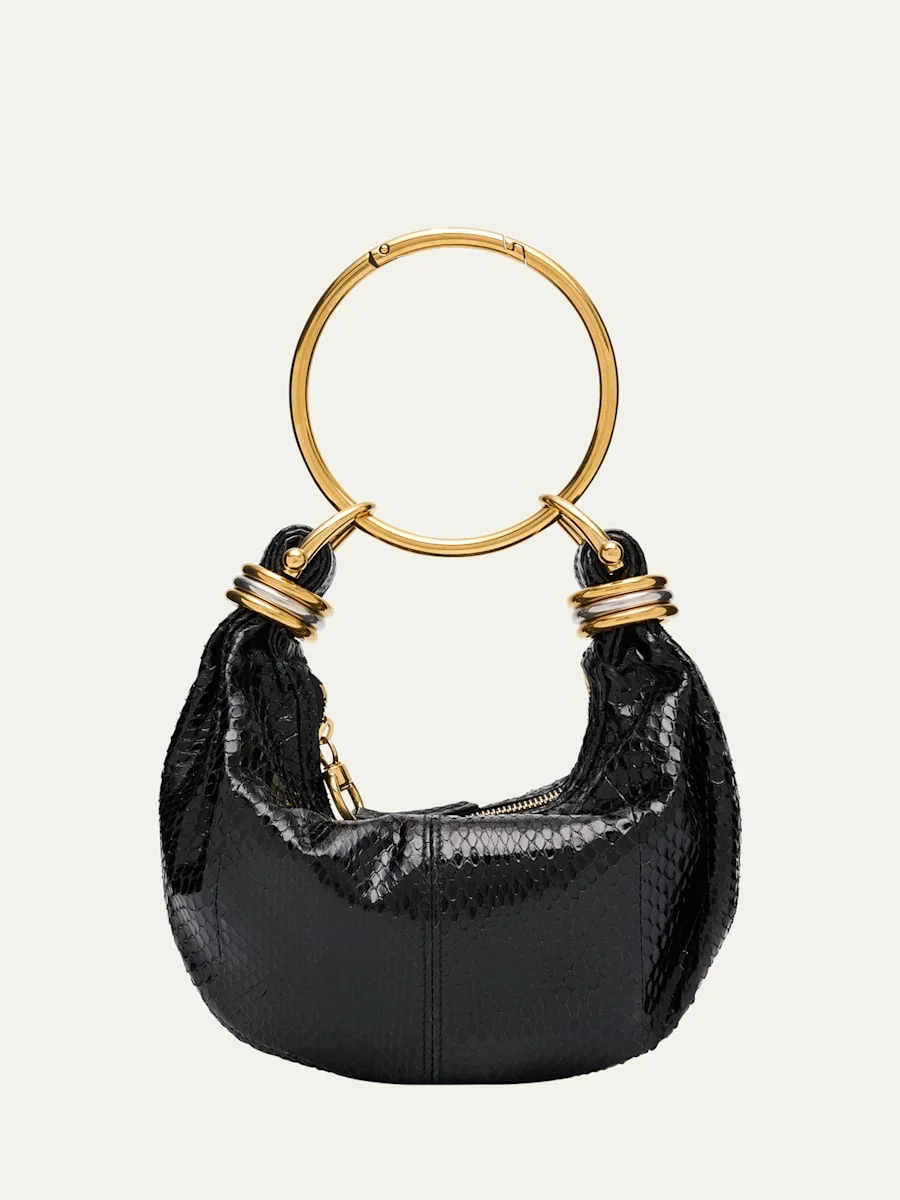 Chloe's snakeskin leather hobo bag features a chic rounded shape, elevated by a unique bracelet handle adorned with stacked ring hardware Metal ring top handle Detachable shoulder strap Can be worn as a tophandle bracelet or shoulder/crossbody bag Zip top closure Lining: Suede Approx. 5.5"H x 8.2"W x 2.3"D Made in Italy