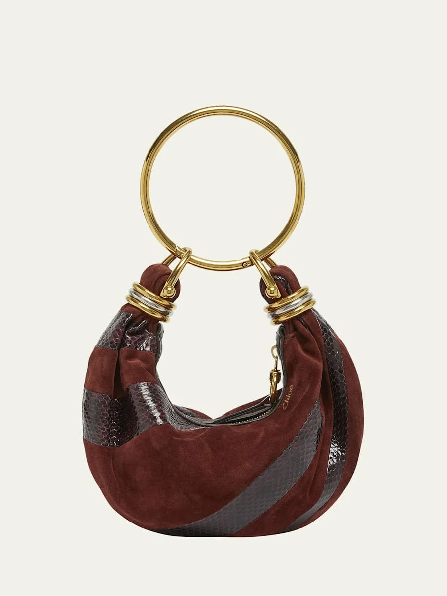Chloe bracelet top handle bag in calfskin suede and ayers snakeskin Removable bracelet metal ring top handle Detachable, adjustable shoulder strap Can be worn as a top handle or shoulder bag Zip top closure Interior, one card slot Lining: Leather Approx. 5.5"H x 12.5"W x 3.9"D Professional cleaning recommended Made in Italy Online Inquiries: BGS21_V6JEK| Store Inquiries: #5015120