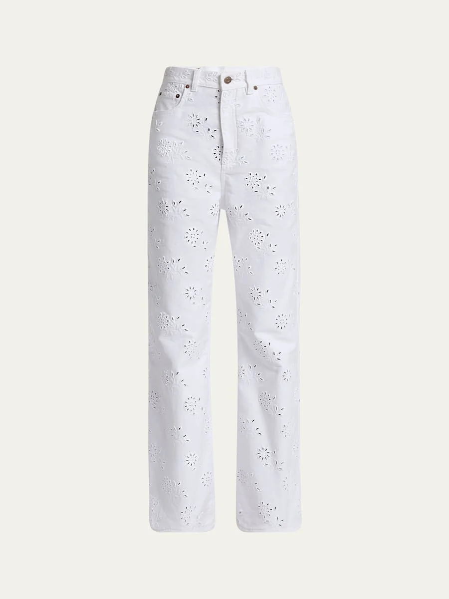 Chloe jeans in broderie anglaise white-wash denim Leather logo patch back High rise Five-pocket style Straight legs Full length Button/zip fly; belt loops Cotton Dry clean Made in Italy Online Inquiries: BGS21_BA3C3| Store Inquiries: #5024460