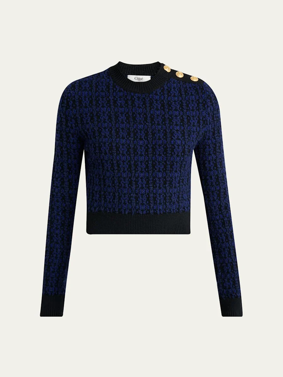 Chloe boucle knit sweater featuring a three-button shoulder detail Crew neckline Long sleeves Fitted Cropped length Ribbed cuffs and hem Pullover style Wool/silk Dry clean Made in Italy Online Inquiries: BGS21_BA3BP| Store Inquiries: #5024445