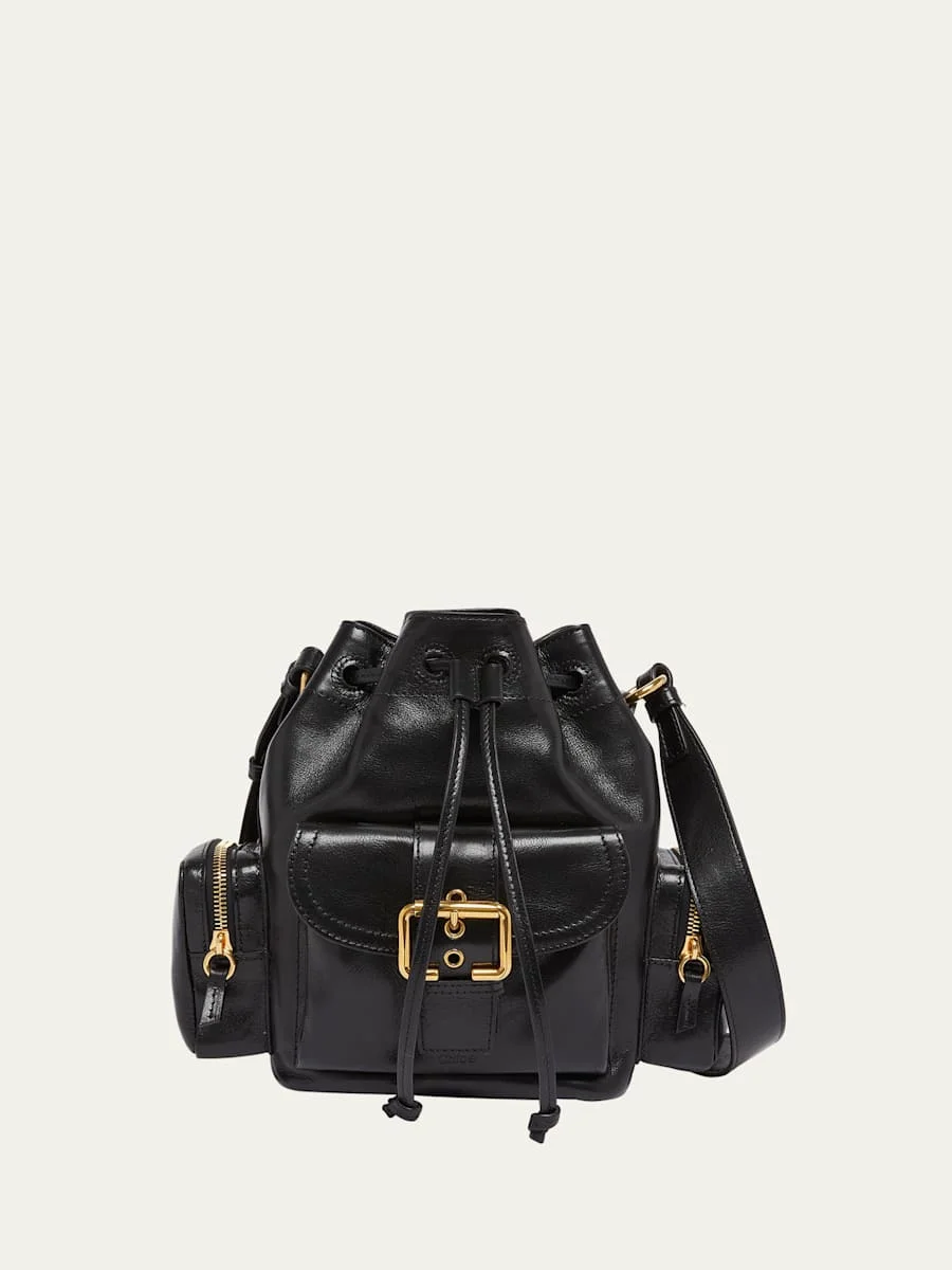 Chloe bucket crossbody bag in shiny calfskin leather Adjustable crossbody strap Drawstring closure Exterior, one buckle flap pouch and two zip pouches Interior, one slip pocket Lining: Cotton/linen Approx. 10.2"H x 9"W x 5.1"D Professional cleaning recommended Made in Italy Online Inquiries: BGS21_V6BAA| Store Inquiries: #4865443