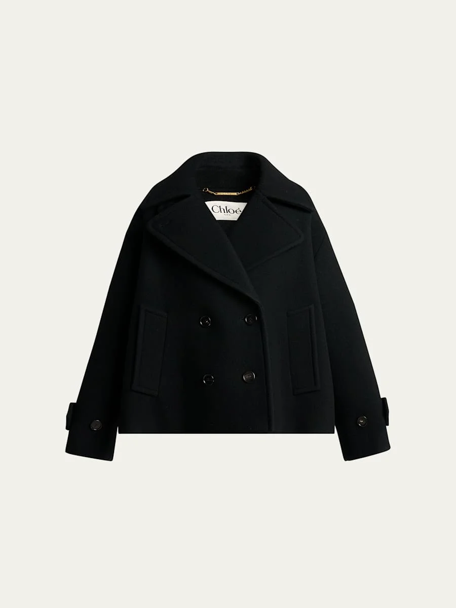 Chloe peacoat in wool-blend Notch lapels; double-breasted front Long sleeves; button-tab cuffs Hipe wel tpockets Straight fit Hip length Virgin wool/nylon/polyamide Lining: Viscose/cotton Dry clean Imported Online Inquiries: BGS21_BA88P| Store Inquiries: #5051253