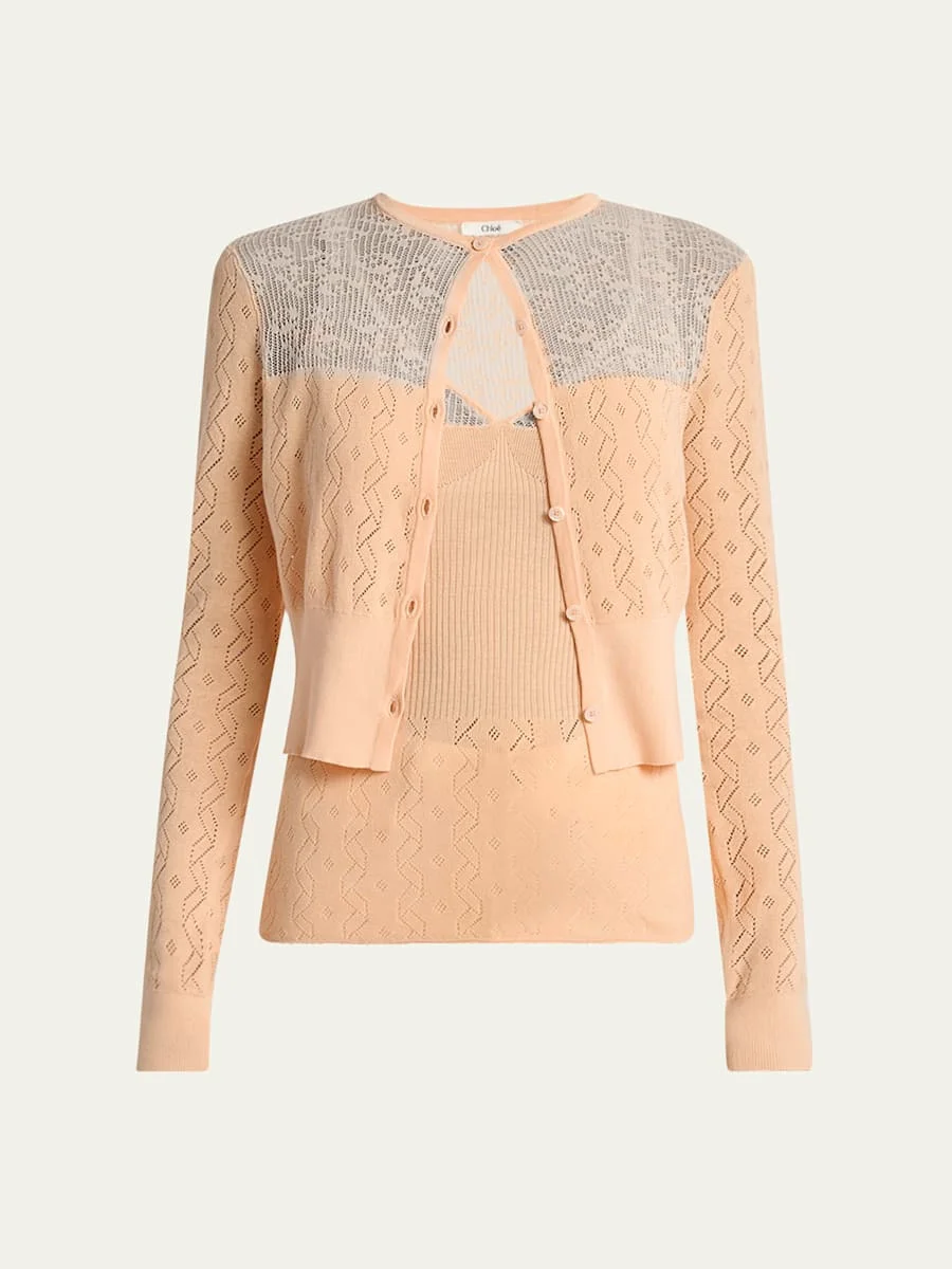 Chloe pointelle embroidery top mimics the look of a cardigan layered over a camisole Crew neckline, button front Long sleeves Slim fit Cotton/nylon/polyamide/elastane Lining: Cotton Dry clean Imported Online Inquiries: BGS21_BA6YX| Store Inquiries: #5043268
