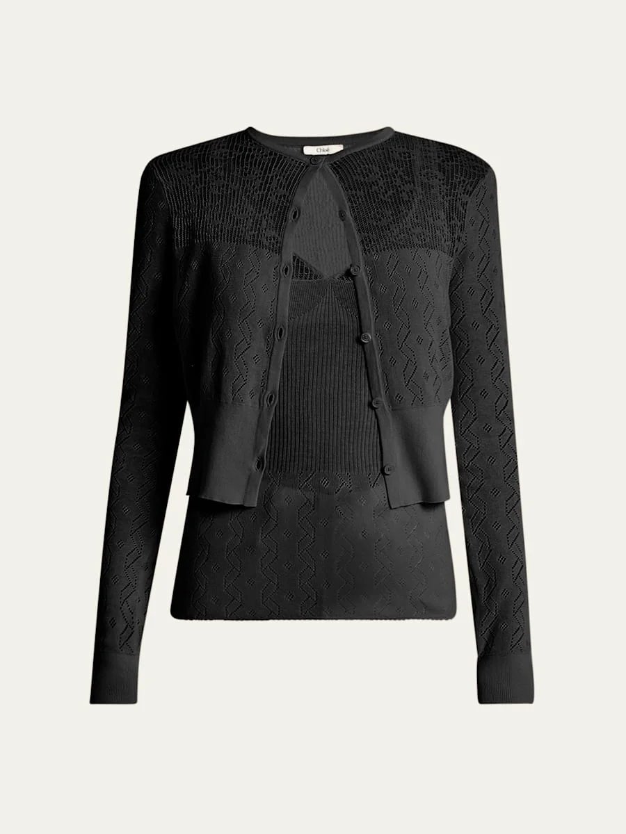 Chloe pointelle embroidery top mimics the look of a cardigan layered over a camisole Crew neckline, button front Long sleeves Slim fit Cotton/nylon/polyamide/elastane Lining: Cotton Dry clean Imported Online Inquiries: BGS21_BA6YX| Store Inquiries: #5043268