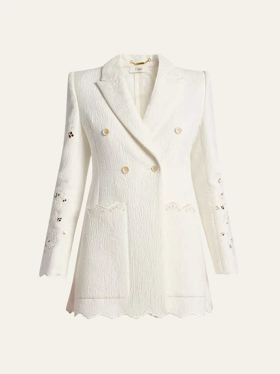 Chloe jacket crafted in spongy jacquard with tonal floral broderie anglaise Detailed with scalloped embroidered edges Peak lapels; doublebreasted front Long sleeves Side patch pockets Doublevented back Aline fit Cotton/nylon/polyamide/linen Lining: Cotton Dry clean Imported