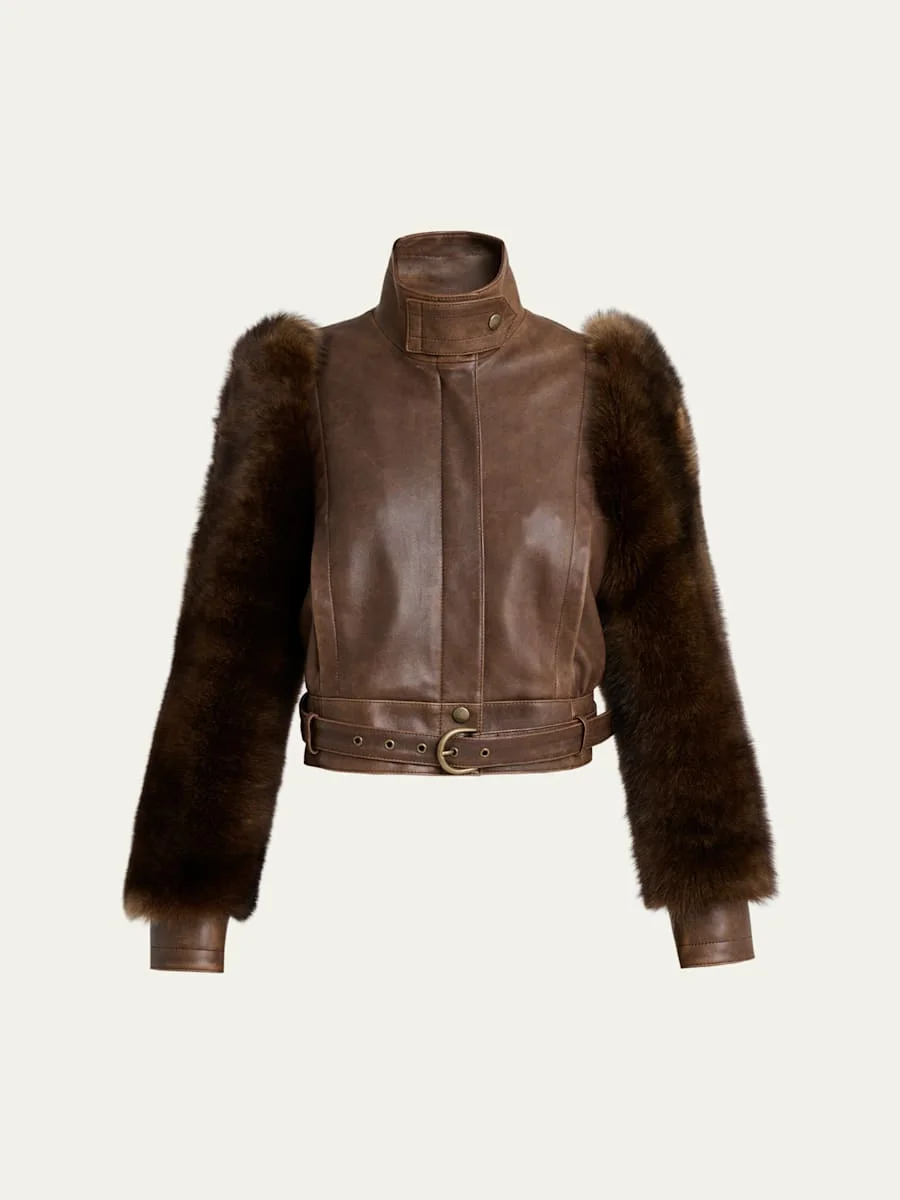 Chloe lambskin leather bomber jacket with faux fur (nylon) sleeves Stand collar with throat latch; concealed zip front Long sleeves Hip welt pockets Straight fit Hip length Belted hem Leather/nylon/polyamide Lining: Viscose/cotton Dry clean Made in Italy Online Inquiries: BGS21_BA3BZ| Store Inquiries: #5024456