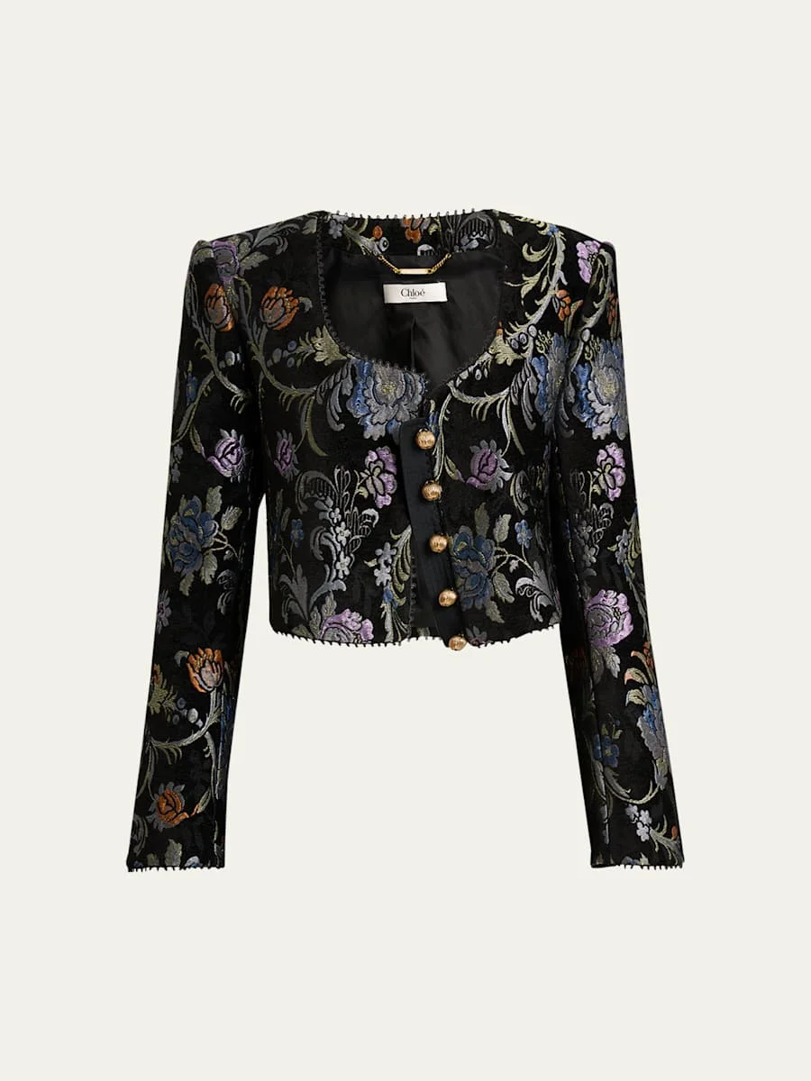 Chloe jacket is crafted of luxe floral brocade, trimmed with loop embroidery, and finished with goldtone ball buttons Scoop neckline; single-breasted front Long sleeves Straight fit Cropped length Button closure Viscose/polyester/silk Lining: Viscose/cotton Dry clean, professional cleaning recommended Made in Italy Online Inquiries: BGS21_BAZEL| Store Inquiries: #5356903