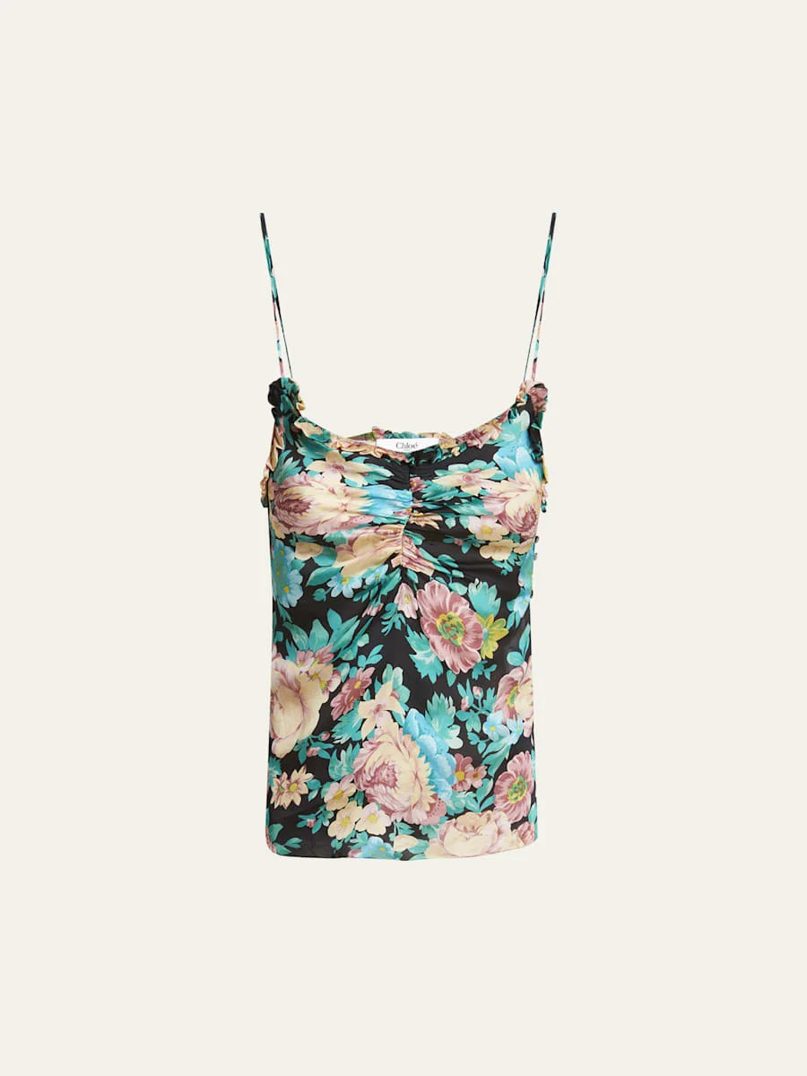 Floral Ruched Ruffle-Trim Silk Tank Top