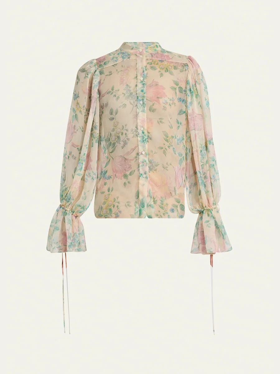 Chloe top featuring a floral print and balloon sleeves with tie ruffle cuffs Band collar; button front Long sleeves Relaxed fit Silk Made in France Online Inquiries: BGS21_B9VK0| Store Inquiries: #4982879