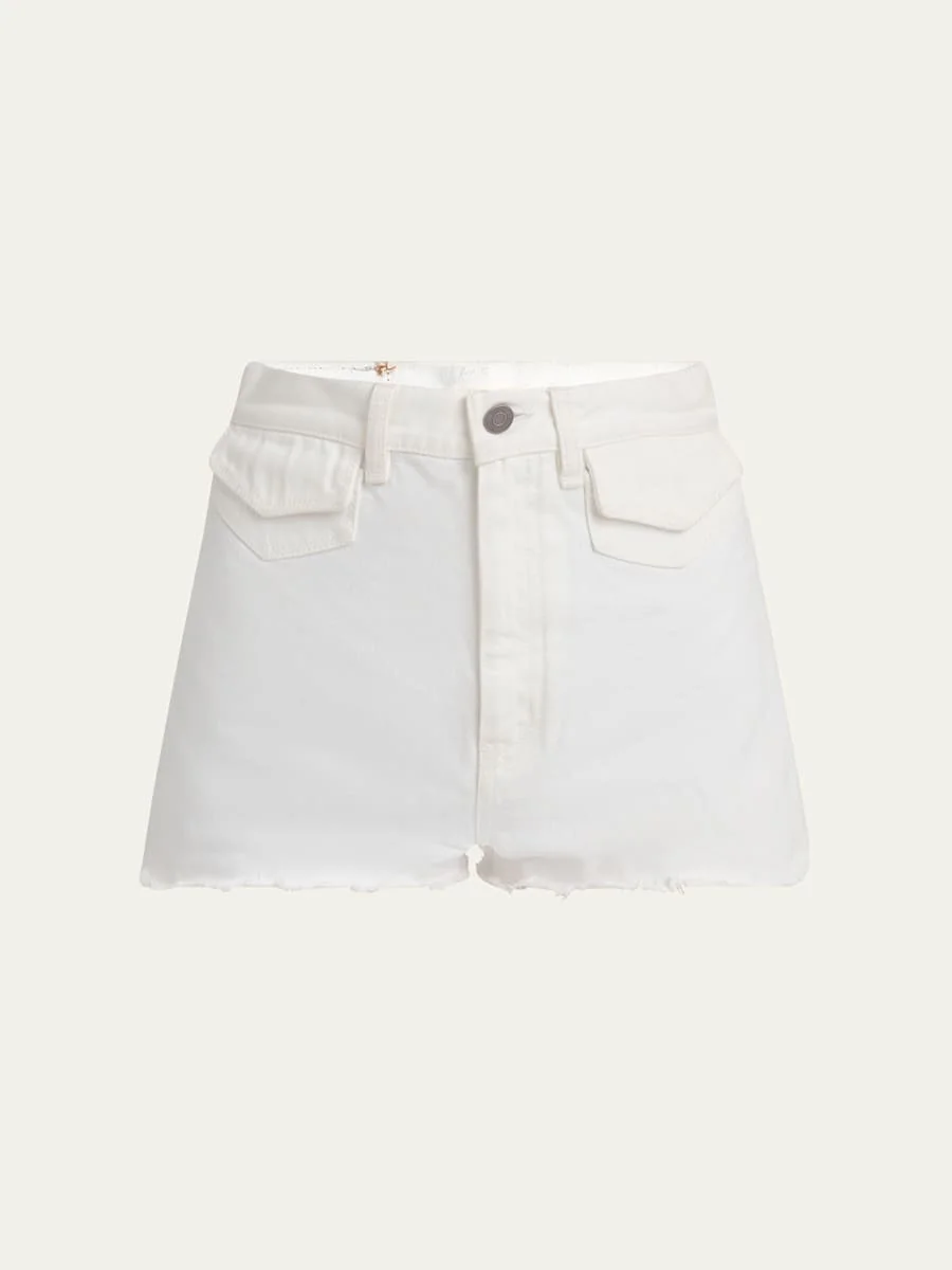 Chloe shorts in cotton denim with back leather logo patch and chewed hems High-rise sits high on the hips Small front flap pockets Back patch pockets Relaxed, high-cut legs Button/zip fly; belt loops Cotton Dry clean Made in Italy Online Inquiries: BGS21_BA6YR| Store Inquiries: #5043262