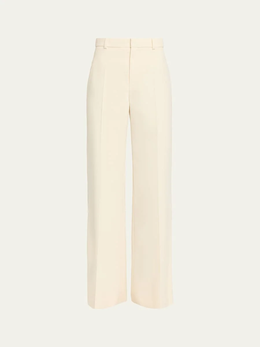 Chloe trousers in wool crepe High rise Flat front Wide legs Full length Hook/zip fly; belt loops Wool Lining: Silk Imported