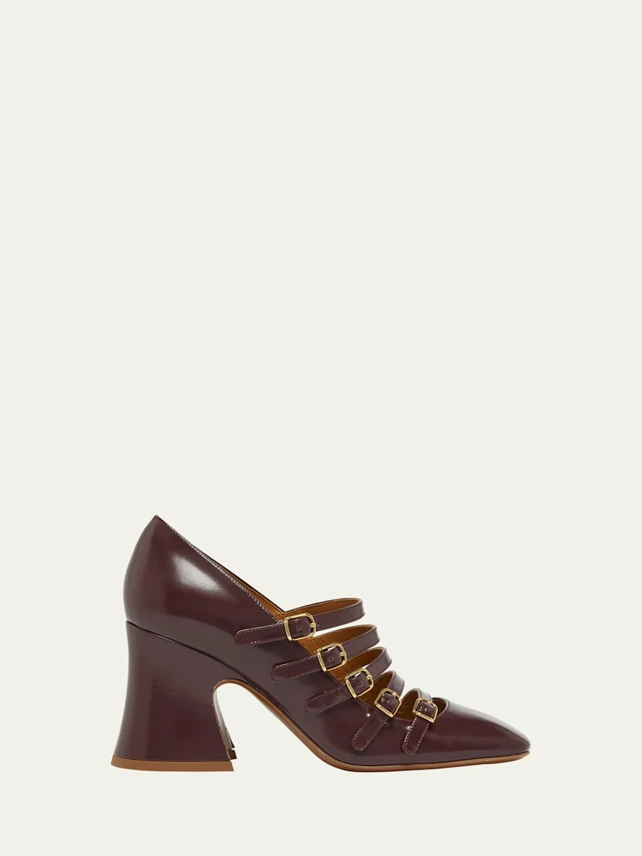 Chloe "Janis" Mary Jane pumps in patent calfskin leather 3.15 in / 80 mm covered block heel Square toe Five adjustable Mary Jane straps Lining: Leather Leather outsole Professional cleaning recommended Made in Italy Online Inquiries: BGS21_X6W92| Store Inquiries: #5016972