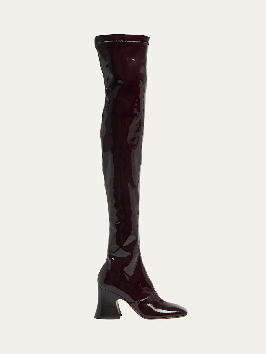 Chloe "Janis" over-the-knee boots in patent calfskin leather 3.15 in / 80 mm stacked block heel Square toe Stretch collar Side zip for easy on/off Leather outsole Lining: Leather Professional cleaning recommended Made in Italy Online Inquiries: BGS21_X6W97| Store Inquiries: #5016977