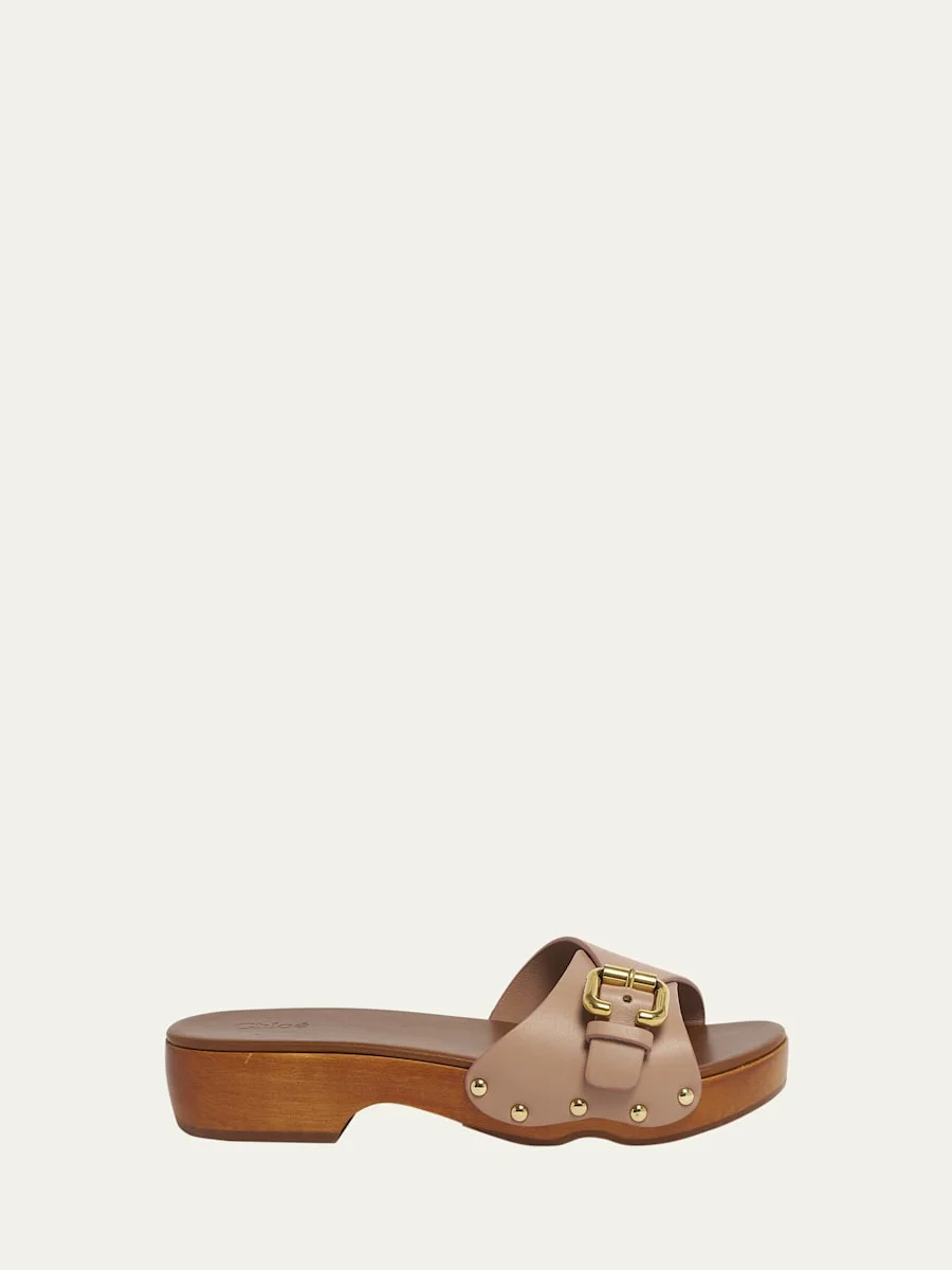 Chloe "Jeannette" calfskin leather clog sandals with a buckle strap accent 1.50 in / 40 mm flat heel Open toe Wide band upper Slide style Manmade outsole Lining: Leather Professional cleaning recommended Made in Spain Online Inquiries: BGS21_X6W94| Store Inquiries: #5016974