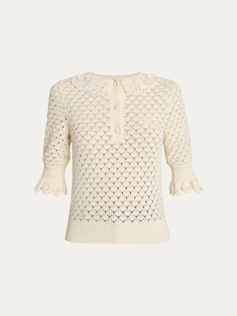 Chloe openwork knit polo top featuring a lace collar and scalloped ruffle cuffs Peter Pan collar; threebutton front 3/4 sleeves Slim fit Ribbed hem Pullover style Wool/silk Dry clean Made in Italy